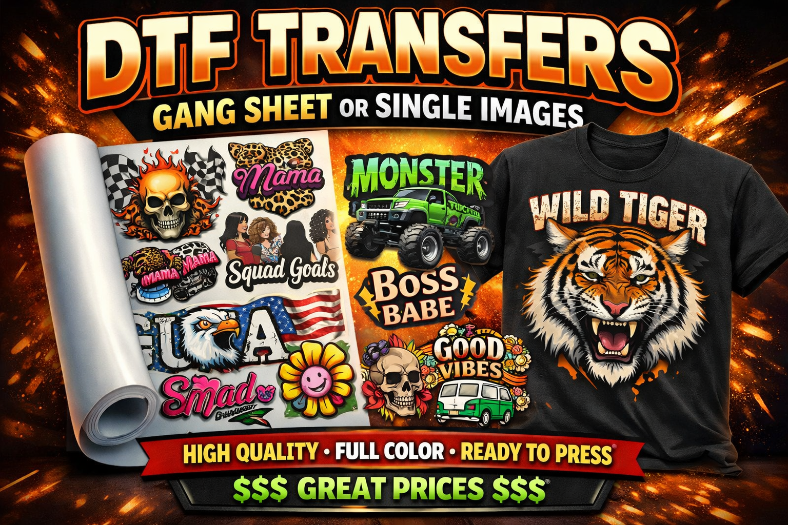 We print Direct to Film (DTF) transfers - DTF Gang Sheet Builder and individual DTF images. Great prices!